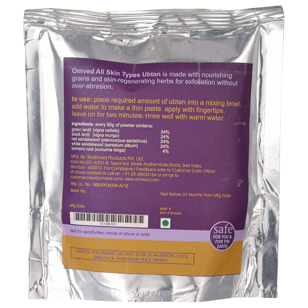 Turmeric corrects the complexion white sandalwood cools and hydrates red sandalwood prevents skin infections green moong opens blocked pores and maintains the ph balance black urad removes dead cells and tightens pores. It is the perfect way to naturally cleanse, exfoliate and detoxify your skin. Suitable for all skin types.