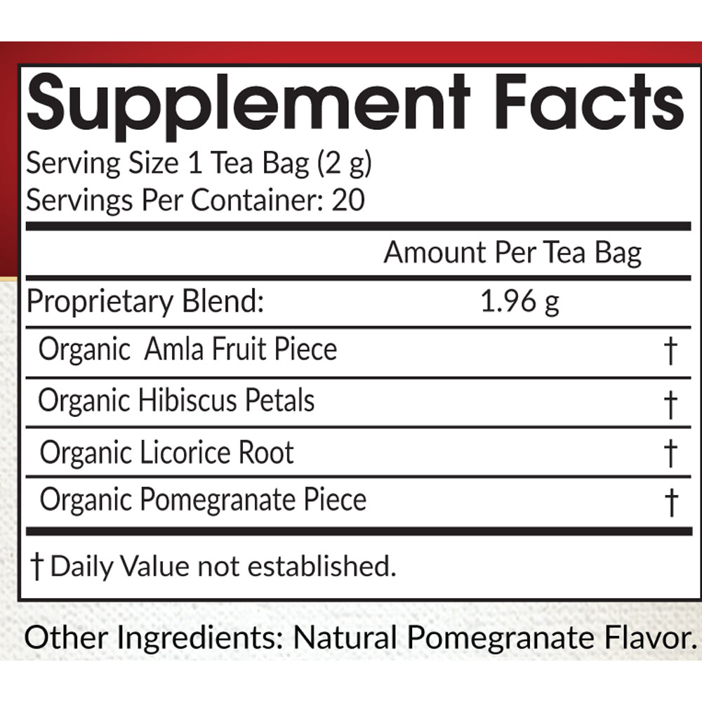 Ingredients: Dried Amla Pieces, Amla Fruit Powder, Hibiscus Petals, Dried Pomegranate Pieces, Natural Pomegranate Flavor