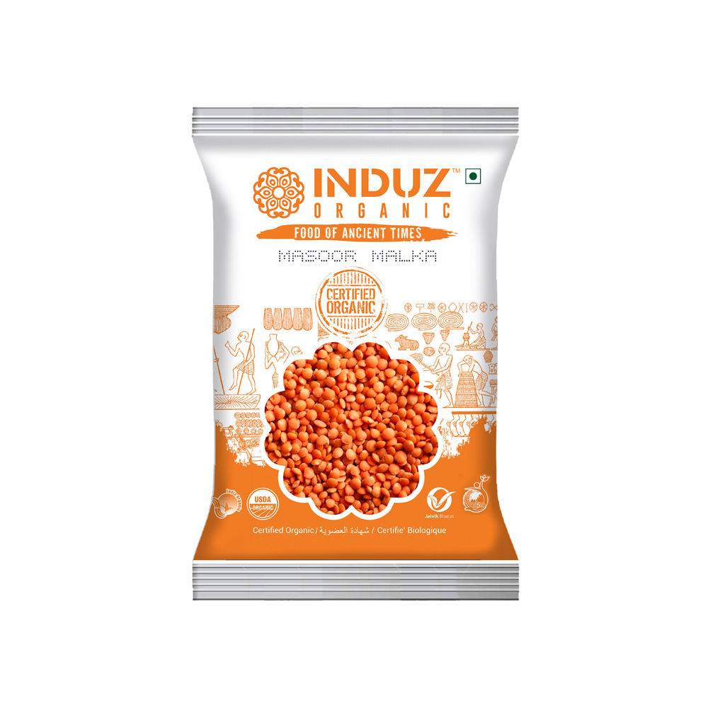 Induz Organic Masoor Malka -500 GMS is 100% Natural, Non GMO & Certified Organic Masoor Dal. Induz Organic Masoor Malka - 500 GMS has been cultivated without using any type of harmful chemicals or pesticides & herbicides. So all the benefits of this pulse are intact in the pack. The Vegans must consider this Organic Masoor Dal for all its benefits.