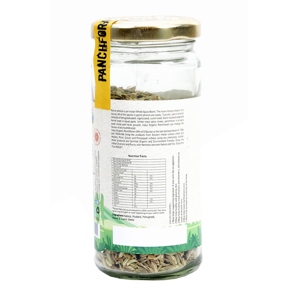 Induz Organic Panchforan - 100 GMS is a mixture of 5 spices – Fenugreek, Cumin, Nigella, Fennel & Mustard seeds. Each & every spice is Certified Organic & has been obtained from Organic farmlands across India. This spice is absolutely pure as it has not gone through any type of chemical processing. So this Organic Panchforan adds the genuine taste & flavor in Indian cuisine.