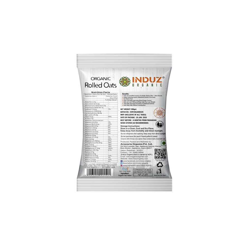 Benefits: Induz Organic Rolled Oats are rich in dietary Fibre; good for heart for its high Magnesium content; provides energy for whole day for being rich in Protein; Antioxidants fight against free radicals & protect the body from various health disorders; a healthy breakfast cereal for the Diabetics too.