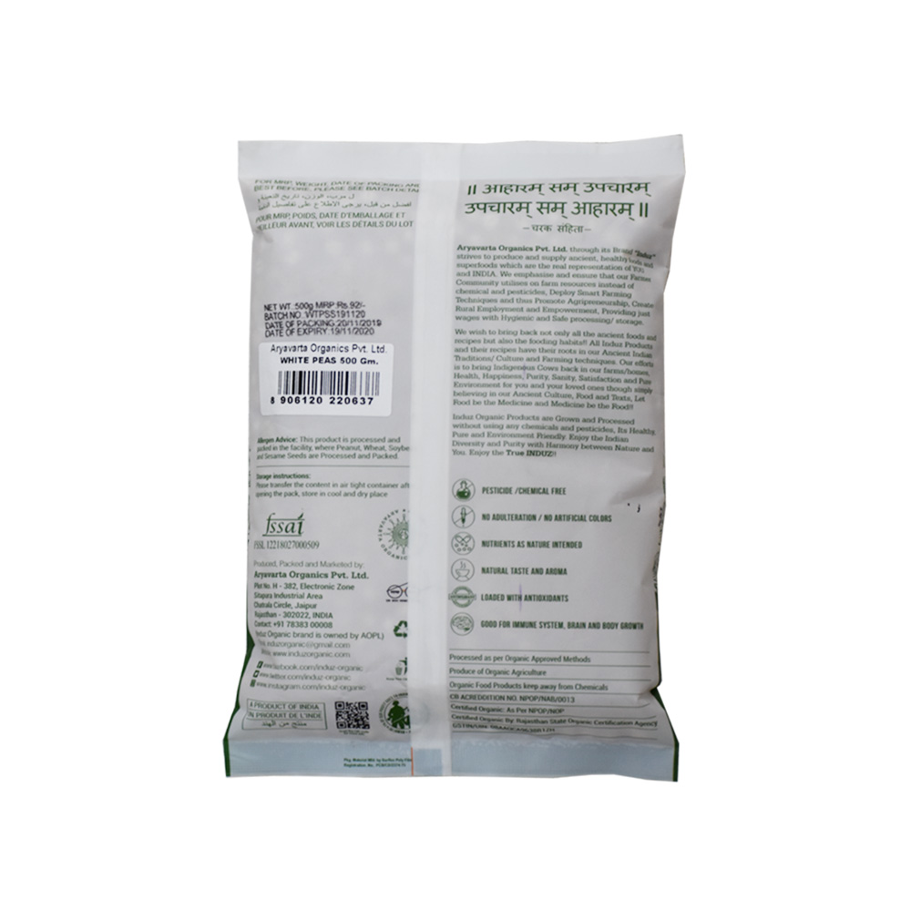 Induz Organic White Peas - 500 GMS is 100% Natural, Non GMO & Certified Organic White Peas. Induz Organic White Peas - 500 GMS has been cultivated without using any type of harmful chemicals or pesticides & herbicides. So all the benefits of this pulse are intact in the pack.