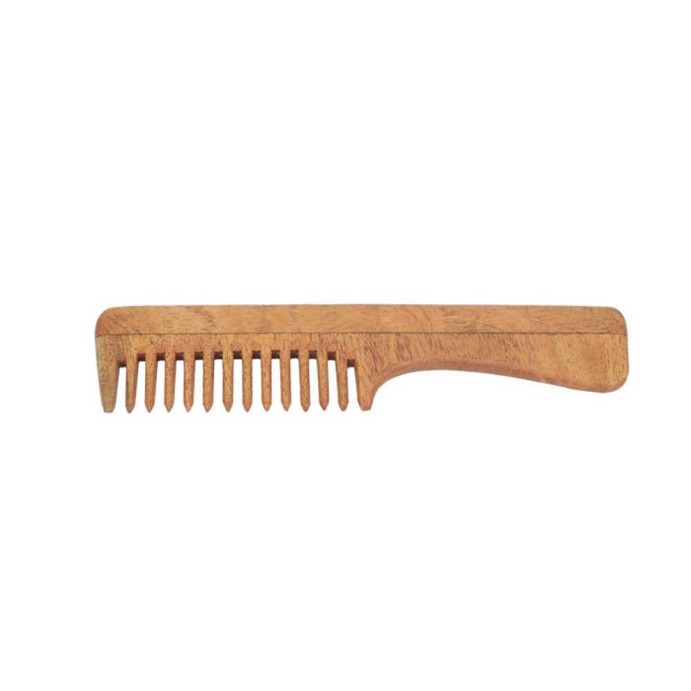 Made from the wood of Neem tree (Azadirachta indica) - this 'Wide Teeth Neem Wood Comb (with handle)' has some basic features.