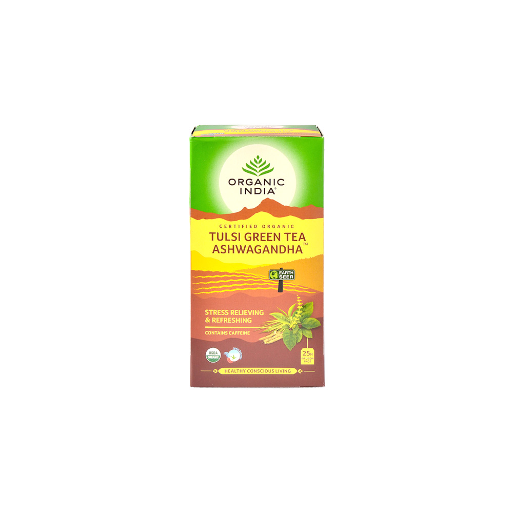 ORGANIC INDIA Tulsi Green Tea Ashwagandha - Stress Relieving & Refreshing, About Tulsi & Green Tea Perfect Combination of Tulsi with Green Tea deeply enhances each other’s remarkable health benefits including a potent abundance of phytonutrients and antioxidants, which protect the body from damaging free radicals. These compounds naturally support the immune & cardiovascular systems and promote detoxification. Enjoy health and energy boost. Wishing you good health & happiness. “Ashwagandha” is one of the serene adaptogenic herbs of Ayurvedic medicine which works very effective in treating sleep disorders and stress disorders. It is most popularly known as “Indian ginseng” as it potentially builds up the physical and mental vigour due to its rich mineral constituents. It also works highly effective to build up sexual and reproductive health.“Lemon Grass” is enriched with vitamin c and has the most refreshing aroma such that it adds a blissful taste and flavour to this tea overall.