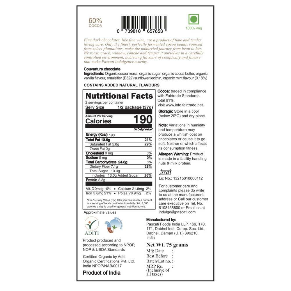 Ingredients: Organic Cocoa Mass, Organic Sugar, Organic Cocoa Butter, Organic Vanilla Flavour, Emulsifier (E322) Sunflower Lecithin, Organic Mint Flavour (0.18%)